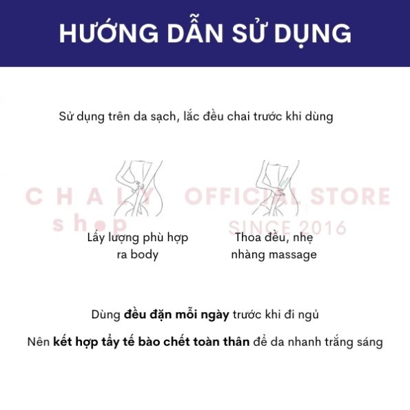 – Mục đích sử dụng: Cấp ẩm dưỡng mịn toàn thân, dưỡng trắng, mờ thâm sạm, ngừa nám