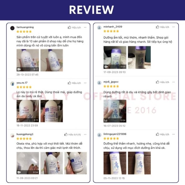 “Theo mình mức giá này vô cùng hợp lý cho 1 chai sữa dưỡng thể trắng da ban đêm. Chất kem dạng sữa lỏng nhẹ, thấm nhanh, không bị vệt, không vón, mùi thơm nhẹ, dưỡng ẩm khá tốt. Mình dùng hết 1 chai thì thấy da cũng có lên tone. Thời gian giao hàng nhanh, đóng gói sản phẩm chắc chắn, hàng chính hãng, chất lượng tốt, sẽ quay lại ủng hộ shop”
