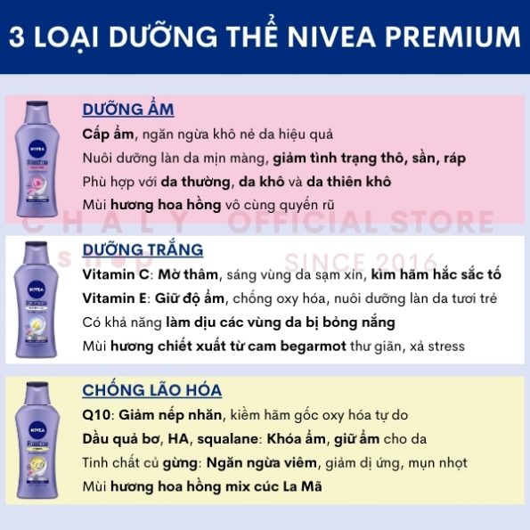 Trước mình có dùng chai Premium Milk màu tím của Nivea, cũng thích rồi đấy, nhưng nó chỉ hợp dùng mùa đông hoặc da khô thôi