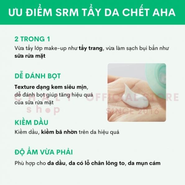 – Không cần thực hiện double cleansing như với tẩy trang dạng dầu, mà tuýp sữa rửa mặt AHA wash cleansing đa năng thay thế cùng lúc cả 2 công dụng: tẩy trang và sữa rửa mặt
