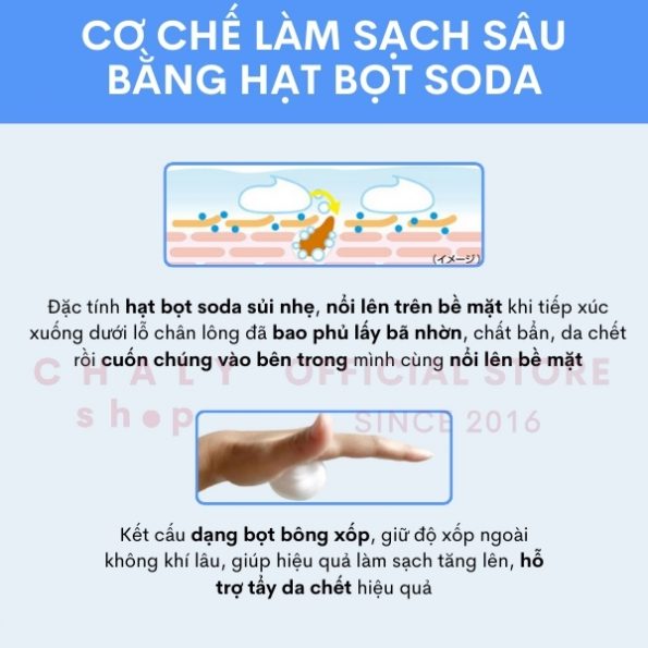 – Các nghiên cứu và thí nghiệm đã chứng minh, các hạt bọt soda này sau khi tiếp xúc xuống dưới lỗ chân lông đã bao phủ lấy bã nhờn, chất bẩn, da chết, rồi cuốn chúng vào bên trong mình và cùng nổi lên bề mặt !