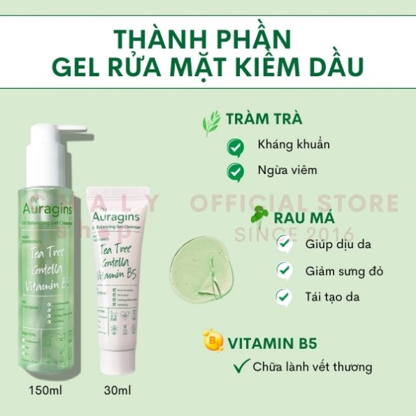 – Sữa rửa mặt The Auragins Oil Balancing Gel Cleanser dịu nhẹ chiết xuất từ tràm trà và rau má, pH đạt chuẩn, cân bằng lượng dầu thừa giúp làm sạch sâu mà không mất đi độ ẩm tự nhiên của làn da