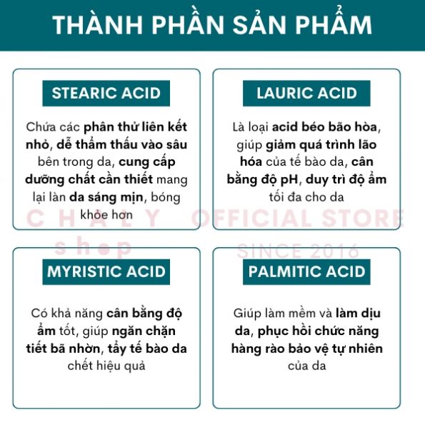 + Stearic Acid: chứa các thành phần hóa học có các phân tử liên kết nhỏ nên dễ dàng thẩm thấu vào sâu bên trong da, cung cấp cho da các dưỡng chất cần thiết giúp mang lại cho bạn làn da sáng mịn và bóng khỏe hơn