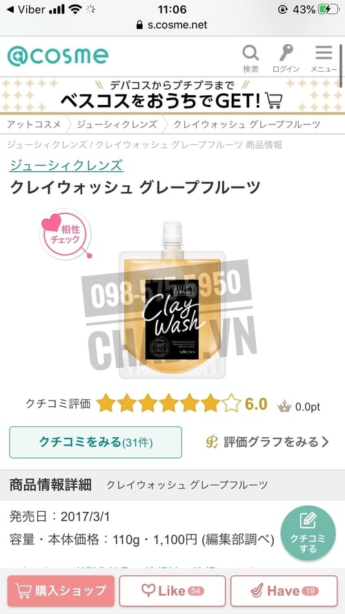– Sữa rửa mặt đất sét Nhật Utena review cao, tới 6.0 trên Cosme ranking Nhật
