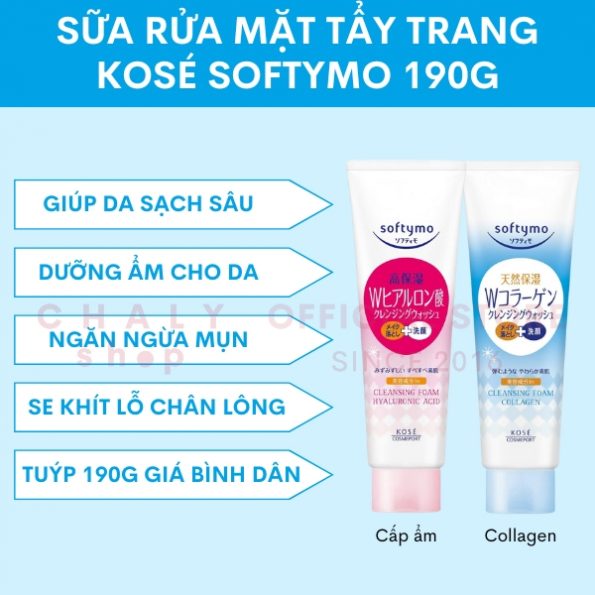 Srm Kose Softymo cleansing foam Nhật gồm 3 loại: Sữa rửa mặt Softymo hyaluronic acid màu hồng cấp ẩm, sữa rửa mặt Kose Softymo collagen 190g chống lão hoá làm căng mượt da và srm Kose Softymo medicated white cleansing wash dưỡng trắng làm mờ thâm nám
