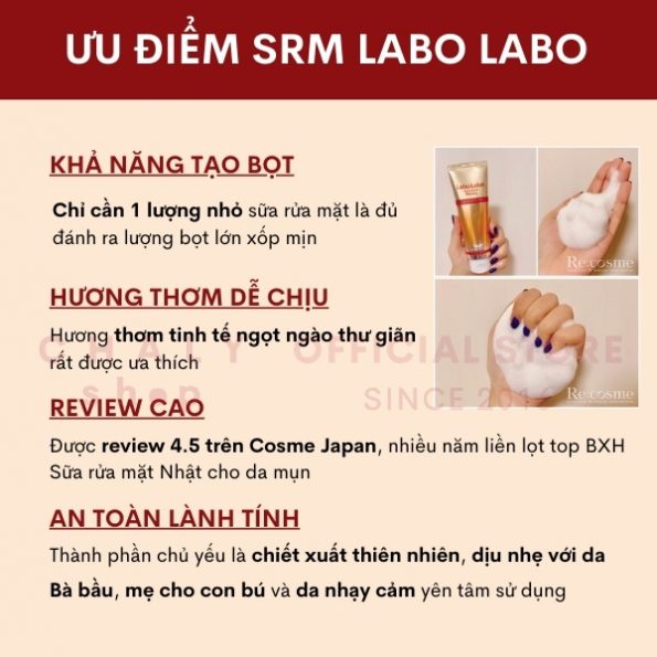 – Một ưu điểm lớn khác của srm Labo Labo Nhật Bản được nhiều chị em review cao là khả năng tạo bọt độc đáo