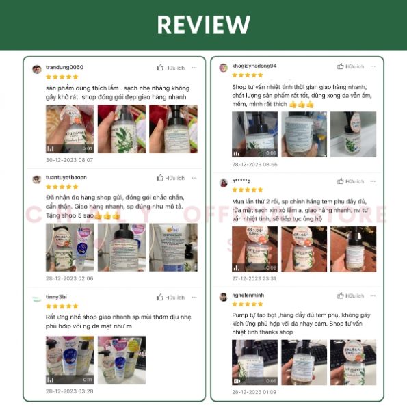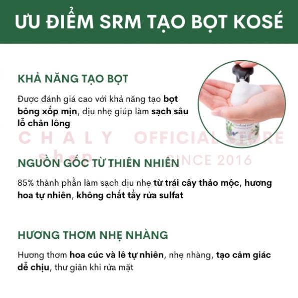 “Hàng chính hãng, mua của shop nhiều lần rồi ạ. Kose Nhật thì nổi tiếng quá rồi, ai cũng đều nghe thấy tên ở đâu đó rồi. Không phải lăn tăn về chất lượng sản phẩm. Tạo bọt tốt, hương thơm nhẹ, rửa sạch, không khô da, rất thích luôn”