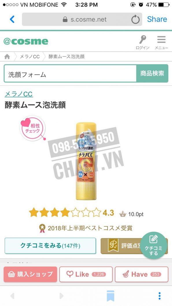 Sữa rửa mặt Melano CC (ロート製薬 メラノCC 酵素ムース泡洗顔 ) được đánh giá cao trên Cosme, 4.3 trên thang điểm 7, lọt danh sách sữa rửa mặt của Nhật được yêu thích