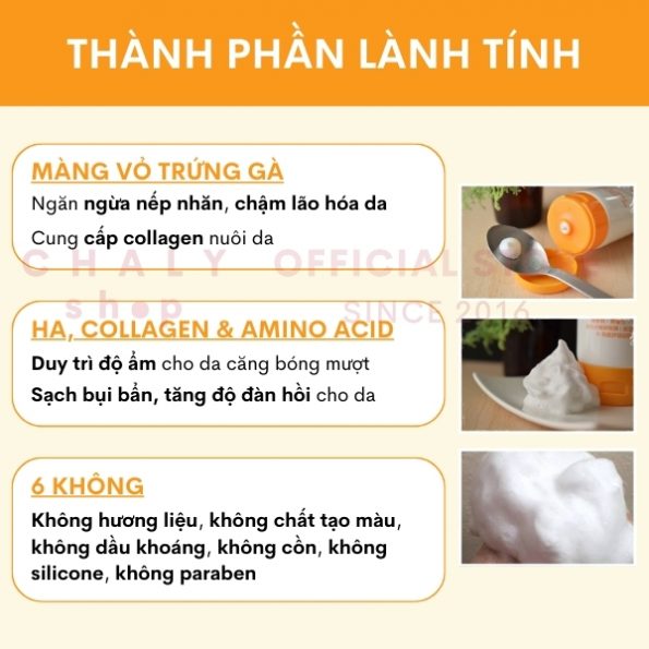 Thành phần protein đậm đặc chiết xuất từ lớp màng vỏ trứng gà kết hợp cùng hyaluronic acid HA, collagen và nhiều loại acid amino giúp bổ sung độ ẩm, tăng cường độ trong suốt, đàn hồi cho bề mặt da, giúp đẩy lùi các nếp nhăn nhỏ ở đuôi mắt, khoé miệng, đánh bay làn da thâm sần nhanh chóng
