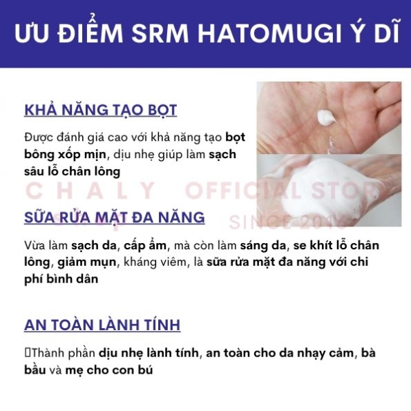 – Điều làm nên uy tín và sự yêu thích lâu năm của người dùng Nhật đối với srm ý dĩ trắng da hatomugi là ở hiệu quả tốt, không làm căng khô da, tạo bọt bông mịn xốp dày cùng với giá thành rẻ