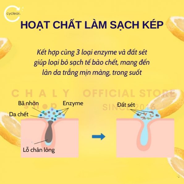 – Kết hợp cùng 3 loại enzyme và đất sét giúp loại bỏ sạch tế bào chết, mang đến làn da trắng mịn màng, trong suốt