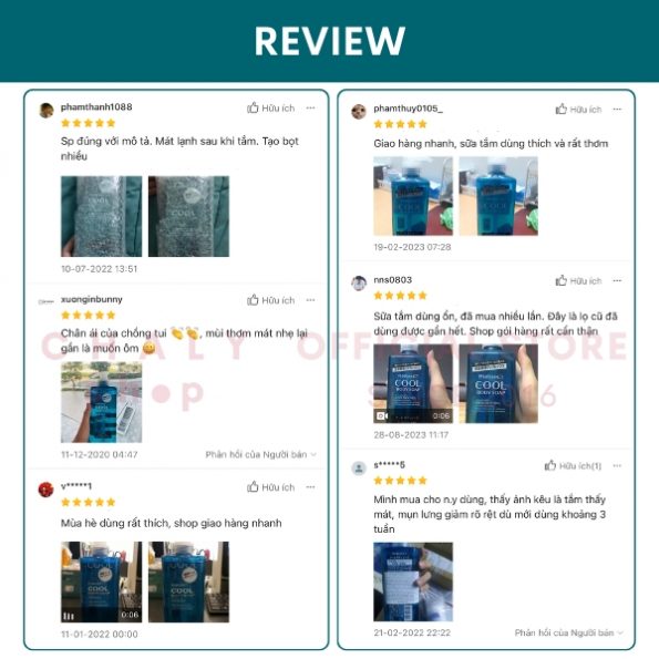 “Sữa tắm này xài rất ok, giá lại rẻ, mùi thơm kiểu the the bạc hà, dùng khá thích, rất mát mẻ, sảng khoái, Shop xử lý đơn nhanh chóng, sản phẩm chính hãng”