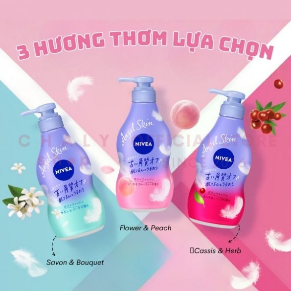 Dòng sữa tắm Nivea Angel Skin Scent Pump Nhật này gồm 4 mùi hương để lựa chọn gồm Savon & Bouquet (hương xà phòng & bó hoa), Flower & Peach (hương hoa & đào) và Cassis & Herb (hương nho & thảo mộc) và Acne Clear (ngừa mụn)