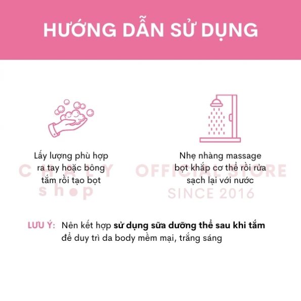 – Mục đích sử dụng: Làm sạch da toàn thân, dưỡng ẩm và dưỡng trắng body