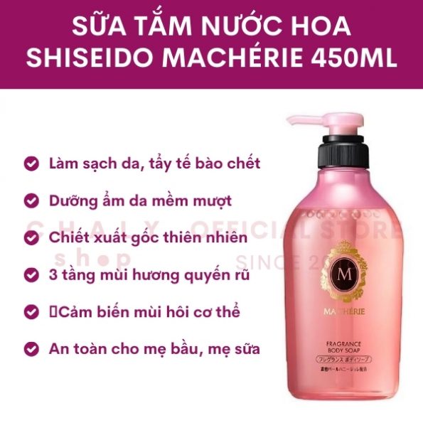 Sữa tắm Macherie của Nhật 450ml mẫu mới là sản phẩm cực kỳ được yêu thích của hãng Shiseido danh tiếng. 3 tầng mùi hương quyến rũ như nước hoa giúp chị em trở nên thu hút, sexy đầy bí hiểm