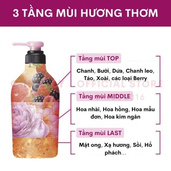 + Tầng mùi Middle: Hoa nhài, hoa hồng, hoa mẫu đơn, hoa kim ngân, raspberry