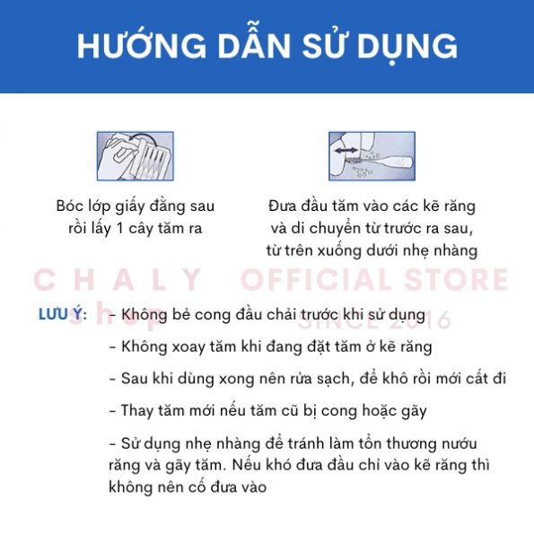 – Không bẻ cong đầu bàn chải trước khi sử dụng. Không xoay tăm khi đang đặt tăm ở kẽ răng