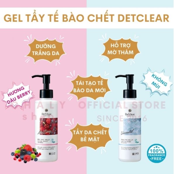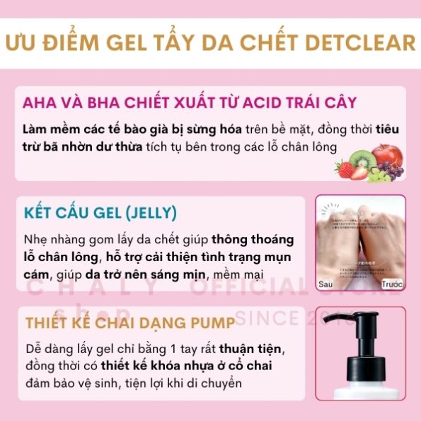 – Ưu điểm của chai Detclear peeling gel của Nhật là tẩy da chết có kết cấu gel (jelly) trong như thạch, nhẹ nhàng gom lấy da chết và rửa trôi đi theo cử động massage của bàn tay. Detclear gel vì thế mà lành tính, ít gây tổn thương cho da hơn hẳn các loại tẩy tế bào chết cơ học hoặc hoá học khác
