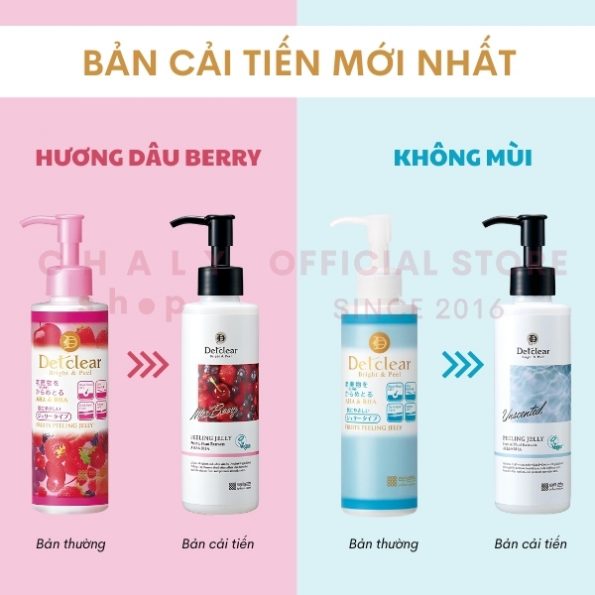 Mình đã từng dùng qua cả 3 loại tẩy da chết detclear bright and peel Nhật là tẩy da chết detclear than hoạt tính, meishoku detclear bright & peel fruit peeling jelly và detclear bright & peel peeling jelly fragrance free (không mùi màu xanh)