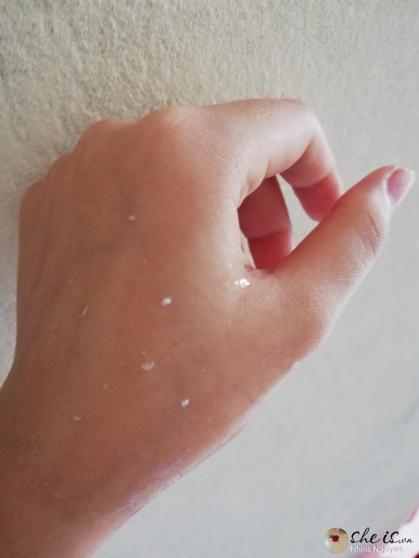 Ban đầu mình sợ hiệu quả peeling tẩy da chết sẽ làm mòn da nên quyết định dùng thử cho vùng cánh tay trước, mình dùng 2-3 nhấn gel để tẩy da chết thì thấy không có nhiều vón tẩy xuất hiện lắm