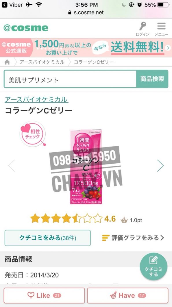 Thạch collagen otsuka review 4.6 trên Cosme Ranking, hương vị việt quất rất ngon nhiều chị em mê mẩn