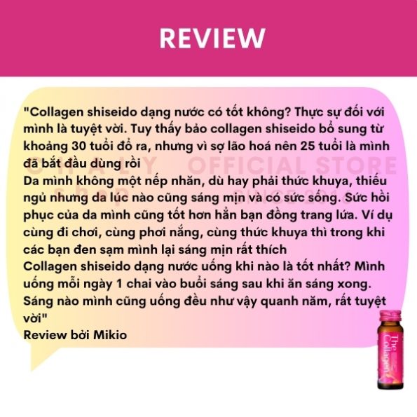 “Collagen shiseido dạng nước có tốt không? Thực sự đối với mình là tuyệt vời. Tuy thấy bảo collagen shiseido bổ sung từ khoảng 30 tuổi đổ ra, nhưng vì sợ lão hoá nên 25 tuổi là mình đã bắt đầu dùng rồi