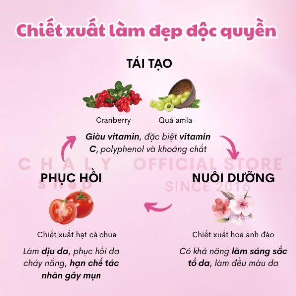 + Chiết xuất gooseberry, một loại dâu màu vàng có nguồn gốc ở vùng trung bộ Ấn Độ. Gooseberry là một nguồn vô cùng dồi dào vitamin C từ thiên nhiên. Không chỉ chống lão hoá, vitamin C còn giúp kích thích sản sinh các sợi liên kết collagen mạnh mẽ bên dưới da. Nhờ đó mà nếp nhăn da, vết chân chim biến đi nhanh chóng