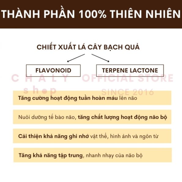 – Thuốc bổ não ginkgo Nhật Bản chứa dồi dào thành phần chiết xuất cao lá cây bạch quả (cao lá cây ichou Nhật) chứa nhiều Flavonoid và Terpene Lactone – 2 chất được khoa học chứng minh có khả năng tăng cường hoạt động tuần hoàn máu lên não vô cùng hiệu quả