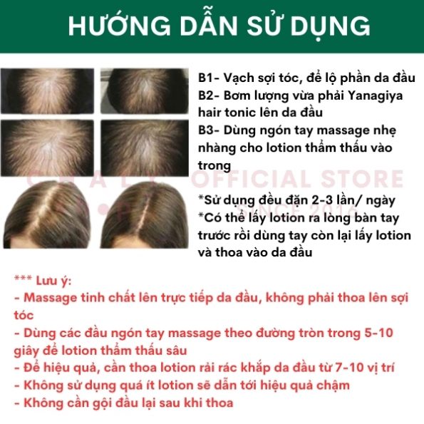 – Bạn nên thoa Yanagiya hair tonic lên khoảng 7-10 điểm khác nhau trên khắp da đầu, sau đó dùng các đầu ngón tay để massage theo hình vòng tròn trong vài phút sẽ mang lại hiệu quả cao nhất