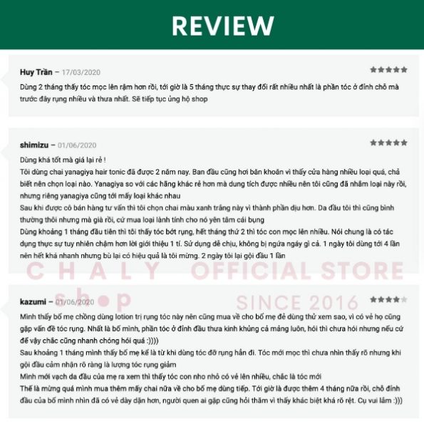 – Điều này được đúc kết từ chính kinh nghiệm của Chaly và từ feedback của khách hàng khi sử dụng Yanagiya hair tonic