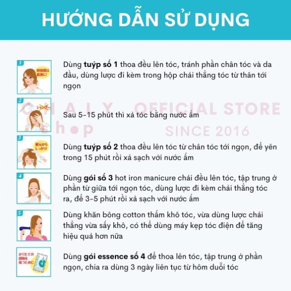 – Thứ tự sử dụng các sản phẩm đã được đánh số sẵn 1,2,3,4 trong hộp duỗi tóc