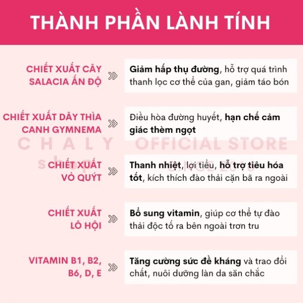 + Chiết xuất cây salacia Ấn Độ: Là một loại cây thảo mộc được người Ấn Độ dùng từ lâu đời, giúp giảm hấp thu đường, kích thích chức năng gan, ruột đào thải để điều hoà đường huyết, giảm táo bón. Thành phần salacia trong viên uống giúp hỗ trợ quá trình thanh lọc cơ thể của gan, giúp tiêu hoá trơn tru, trị táo bón