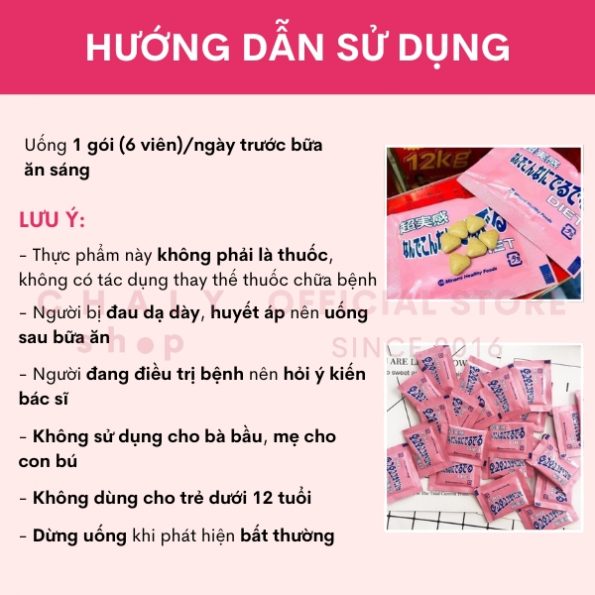 – Mỗi ngày uống 1 gói (6 viên) trước bữa ăn sáng