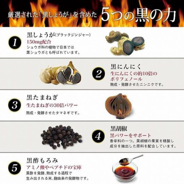Dextrin, reduced maltose starch syrup, black ginger extract (black ginger extract, dextrin), baboon extract (dextrin, chickweed extract), Kinki ginger powder, fermented black garlic powder, fermented black garlic powder, black vinegar mash powder, black pepper extract , L-carnitine fumarate, garcinia extract powder, senna stalk extract powder, gymnema sylvesta powder, candle bush extract powder, cellulose, VC, VE, niacin, pantothenic acid Ca, V.B1, V.B6, V.B2, VA, folic acid, VD, V.B12, cyclodextrin, calcium stearate, fine silicon oxide, caffeine, spice extract