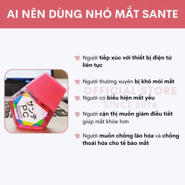 + Nhỏ mắt Nhật Santen PC còn phần nào hỗ trợ tăng thị lực, điều tiết và giảm cận thị ở người học tập và làm việc căng thẳng, sử dụng mắt cường độ cao