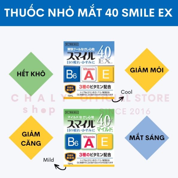 – Thuốc nhỏ mắt của Nhật Smile EX 40 mild/ cool màu xanh lá cây/ xanh dương hiện đã về mẫu mới nhất vừa cập nhật. Bao bì khác biệt nhẹ. Dung tích không đổi 15ml