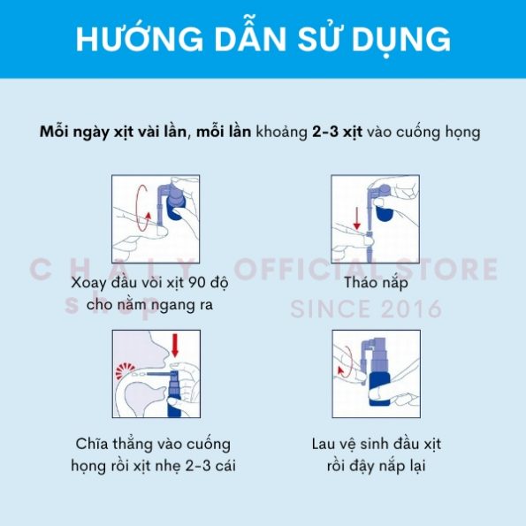 + Chĩa thẳng vào cuống họng và xịt nhẹ khoảng 2-3 cái
