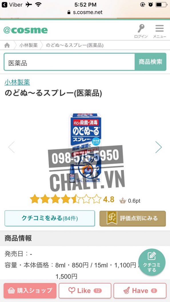 Xịt thuốc viêm họng Nhật Bản review cao tận 4.8 trên Cosme Ranking