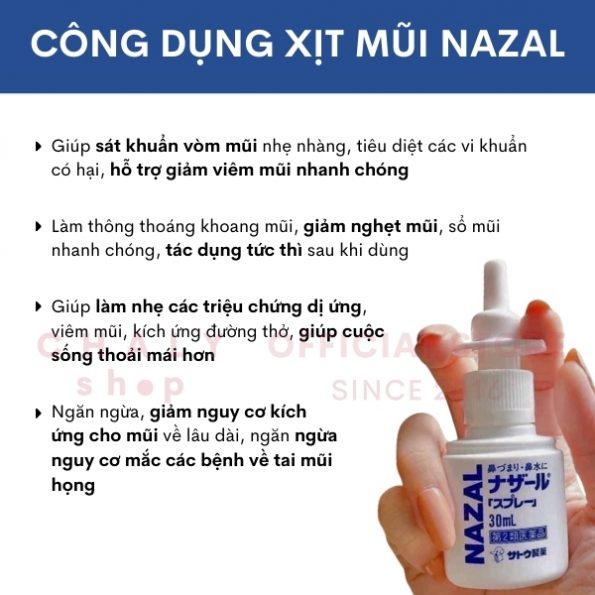 – Về lâu dài, xịt mũi Nazal 30ml Nhật giúp làm nhẹ các triệu chứng dị ứng, viêm mũi, kích ứng đường thở, đặc biệt với những người bị bệnh kinh niên. Giúp cho cuộc sống thoải mái hơn