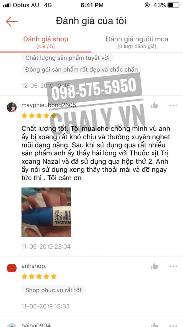 Review về chai xịt thông mũi nazal của khách mua hàng tại Chaly (chị mayphieuhong2605)