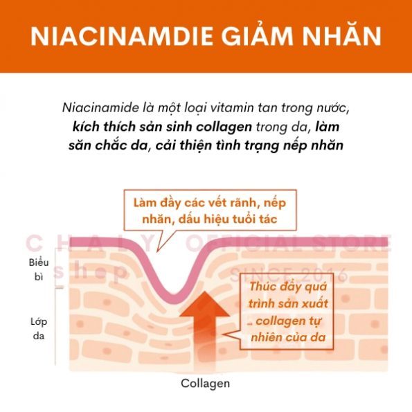 – Hoạt chất Niacinamide hay còn được biết đến là vitamin nhóm B, nổi tiếng với khả năng ngăn ngừa da chảy xệ, làm săn chắc da, cải thiện vết thâm da, làm đều màu da, cho da căng mịn, ẩm mướt