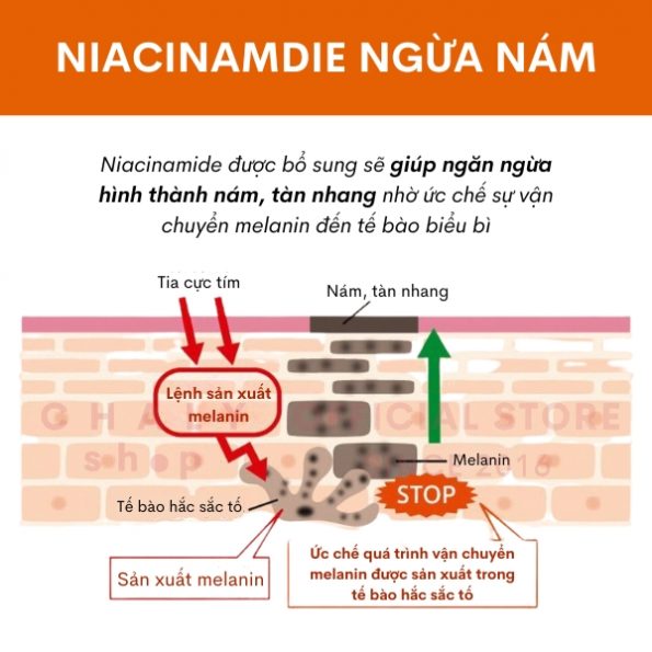 – Trong cuộc sống sinh hoạt hàng ngày, da thường bị hư tổn bởi kích thích của tia tử ngoại UV, khi đó tế bào hắc sắc tố được kích hoạt gây ra nám và tàn nhang. Bổ sung niacinamide vào chu trình chăm sóc da hàng ngày sẽ giúp ức chế hắc sắc tố này bằng cách ngăn sự vận chuyển melanosome đến tế bào biểu bì