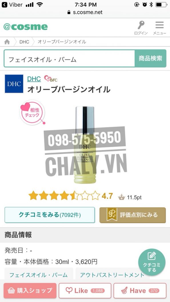 – Tinh dầu olive DHC được đánh giá cực cao tại Nhật với số review lên tới hơn 7 ngàn review trên chyên trang Cosme