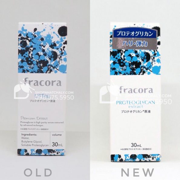 Serum Fracora màu xanh phiên bản mới nhất có sự thay đổi nhẹ về bao bì bên ngoài, cùng tên sản phẩm được đổi từ Proteoglycan Liftest sang Proteoglycan Extract (フラコラ プロテオグリカン原液), nhưng bên trong sản phẩm vẫn không thay đổi