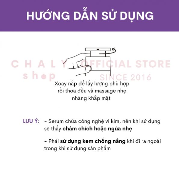 – Được điều chế ở dạng tinh thể tinh khiết tới 99% và có thêm các dưỡng chất vào các gai vi kim, làm dịu và tái tạo nền da tổn thương, hỗ trợ làm sáng da, mờ thâm mụn, giảm kích ứng