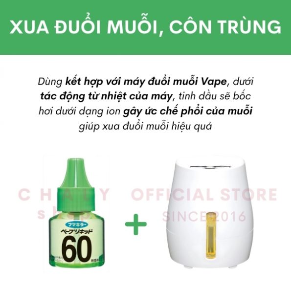 – Tinh dầu muỗi của Nhật Bản dùng kết hợp với máy đuổi muỗi Vape Nhật có tác dụng xua đuổi muỗi nói riêng và các loại côn trùng nhỏ như ong, ruồi ..