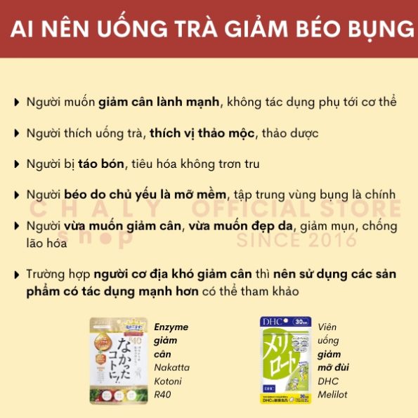 – Trường hợp người cơ địa khó giảm cân, béo lâu năm thì nên sử dụng các sản phẩm giảm cân Nhật có tác dụng mạnh hơn như viên uống giảm mỡ đùi DHC melilot hoặc viên enzyme giảm cân Nakatta Kotoni R40 Nhật