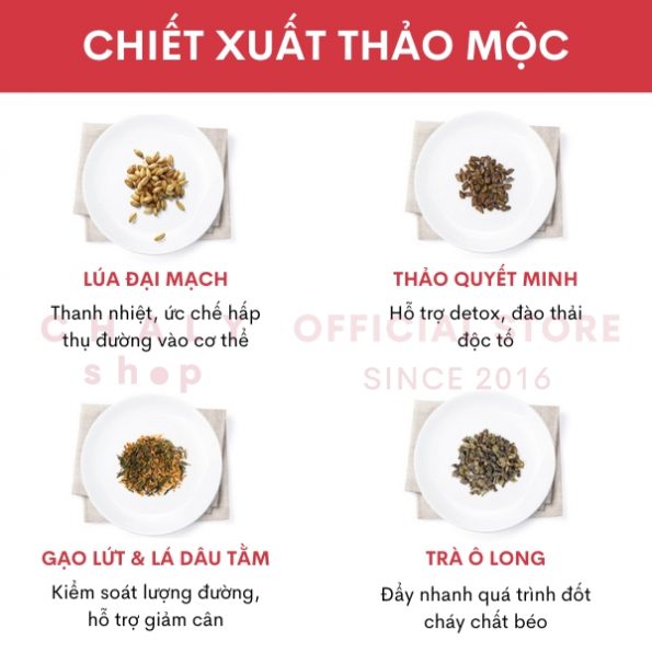 – Thành phần trong trà khá đa dạng gồm có lá dâu tằm, thảo quyết minh, gạo lứt, đại mạch, trà ô long, canavalia ensiformis (đậu trắng), bằng lăng nước, bắp, lá ổi, dây thìa canh, rau cải, cam thảo .. cùng nhiều vị thuốc đông y khác nữa