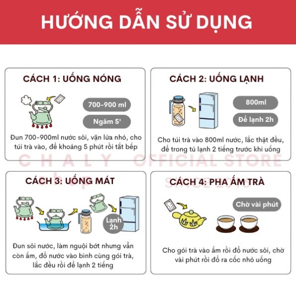 Dùng ấm pha trà cho 1 gói trà vào rồi đổ nước sôi. Chờ vài phút rồi lấy ra cốc nhỏ uống