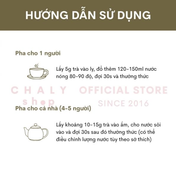 – Pha cho 1 người: Lấy 5g trà vào ly, đổ thêm 120-150ml nước nóng 80-90 độ, đợi 30s và thưởng thức